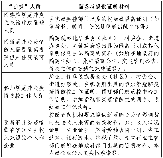 (一)各金融机构要按照《中国人民银行 财政部 银保监会 证监会 外汇局关于进一步强化金融支持防控新型冠状病毒感染肺炎疫情的通知》(银发〔2020〕29号)《中国人民银行办公厅关于新冠肺炎疫情防控期间征信权益保障工作的指导意见》(银发〔2020〕40号)《中国人民银行 外汇局关于做好疫情防控和经济社会发展金融服务的通知》(银发〔2022〕92号)有关精神,建立健全内部协调机制,对因感染新冠肺炎住院治疗或隔壁人员、因新冠肺炎疫情防控需要隔离观察但未住院隔离人员、参加新冠肺炎疫情防控工作人员、受新冠肺炎疫情影响暂时失去收入来源的个人和企业(统称“四类”人群),严格按照文件进行处理,开辟征信权益保护“绿色通道”,做好受疫情影响信息主体征信权益保障工作。