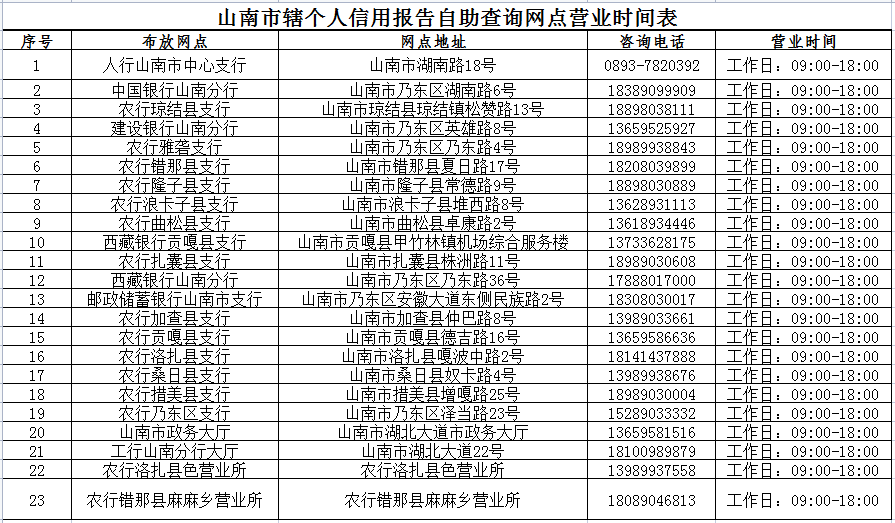 附件:山南市辖个人信用报告自助查询网点营业时间表