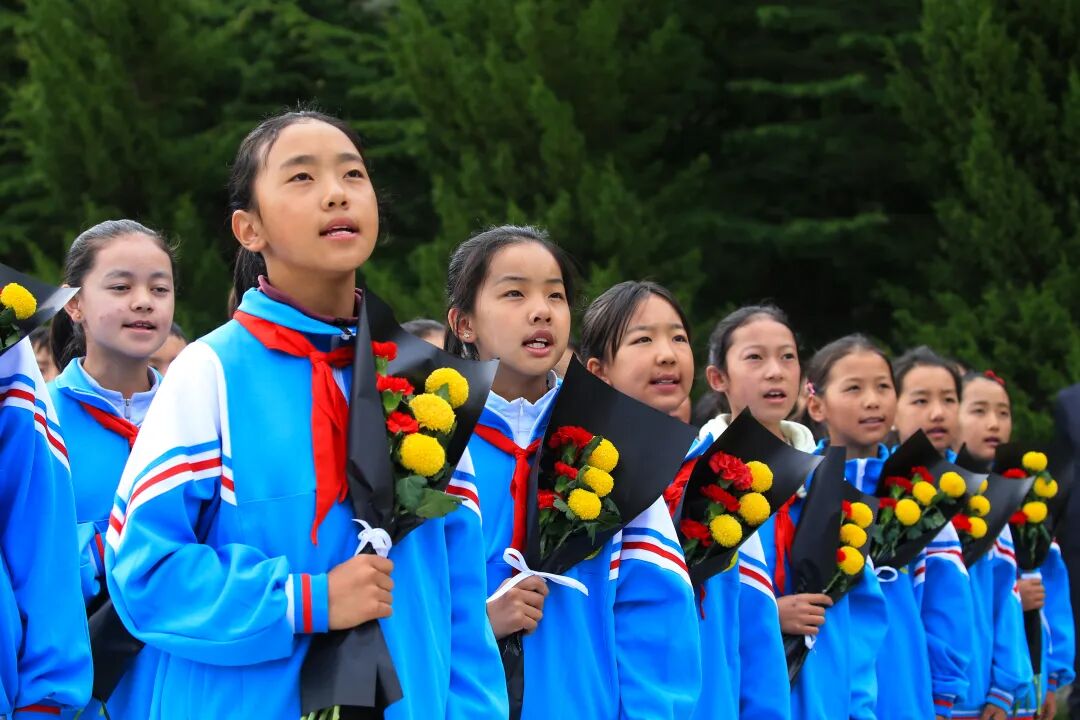 默哀毕,手持鲜花的少先队员面向烈士纪念碑高唱《我们是共产主义接班人》,表达继承先烈的光荣传统、沿着烈士足迹砥砺前行的志向情怀。