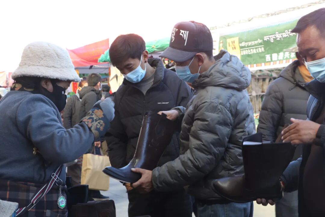 来自桑日县的格桑次仁和浪卡子县的格勒加措是特意赶来的顾客,现场,他俩分别试戴了帽子、试穿了藏靴。格桑次仁说:“他们家的帽子特别好,价格也实惠,我专门来买一顶。”格勒加措笑着说:“我来买藏靴,准备藏历新年穿。”