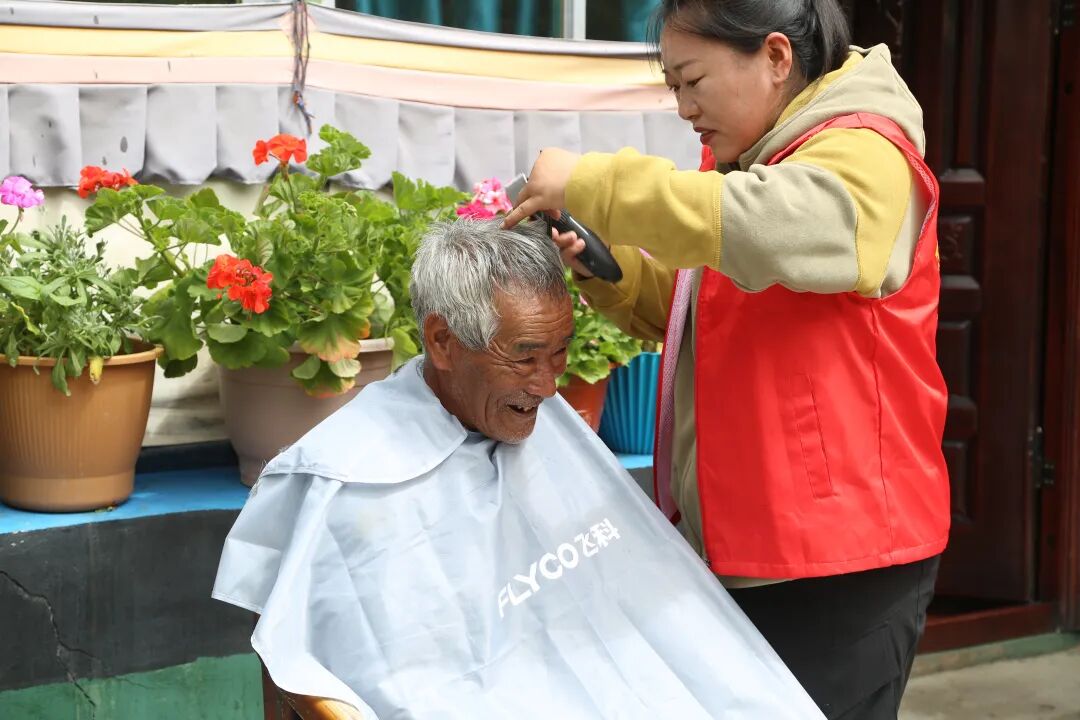 考虑到村里行动不便的老人和残疾人出门困难,驻村工作队还贴心推出“上门服务”。“不用出门,在家就能剪头发,非常方便!”77岁的老人白玛多吉坐在自家院子里,擦拭着刚洗完的头发,笑得合不拢嘴。