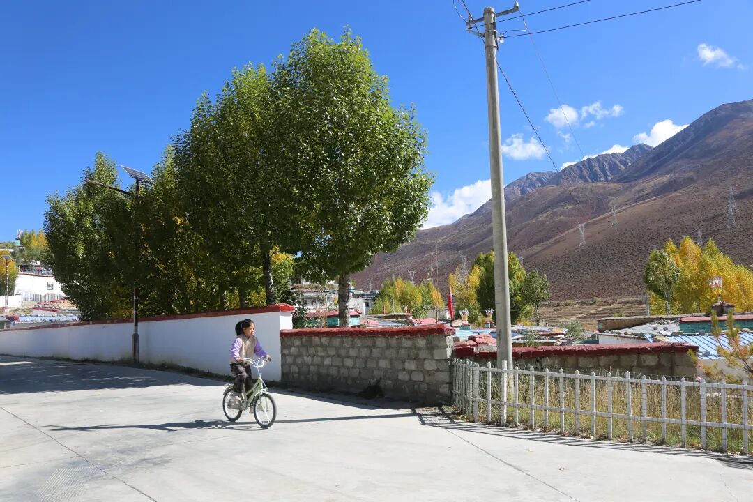 如今,行走在仁青岗村,处处可见整治带来的新气象:村庄周边,收割后的田野在高原的暖阳下显得开阔平整,与错落有致的居住区相互映衬;新硬化的村道如缎带般蜿蜒其间,路旁挺立着叶片金黄的杨树,在秋风中轻轻摇曳;满脸洋溢着幸福笑容的小女孩骑着单车轻快掠过,车轮碾过零星落叶,发出细碎的声响;她身后,白墙蓝檐的藏式民居整齐排列,与金黄的树影、整洁的村容共同构成一幅层次分明的高原秋景图。