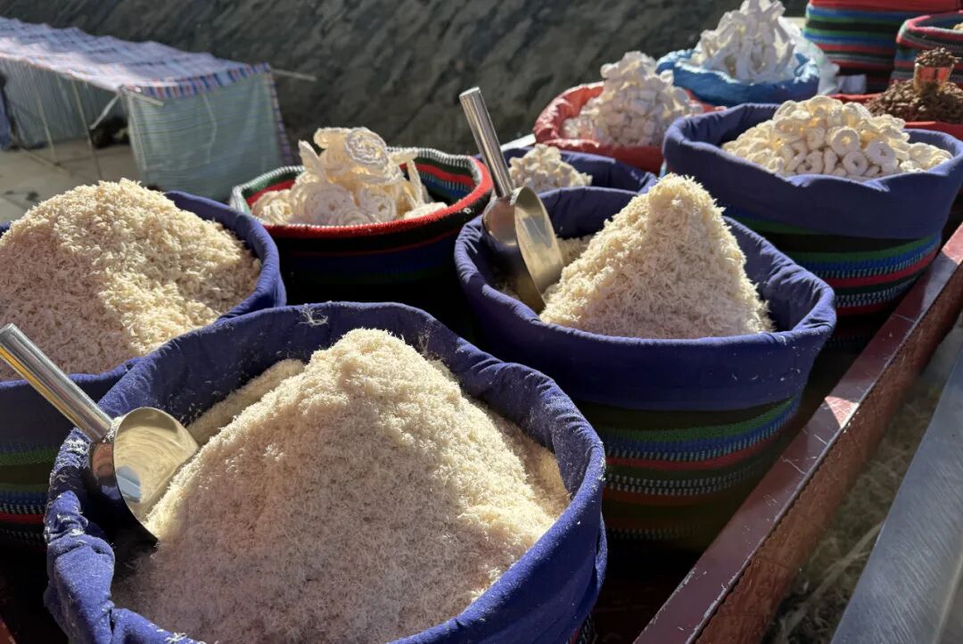 除了热销的牛羊肉,奶渣、酥油、核桃、辣椒等特色农畜产品也备受顾客青睐,成为市民游客的“必买清单”。在措美县哲古镇扎西边旦的摊位前,几位游客正围着奶渣块仔细端详,扎西边旦拿起一块放入客人手中:“尝尝看,这是我们自家手工制作的奶渣,酸甜劲道,越嚼越香。”客人尝后连连点头,当即决定购买。