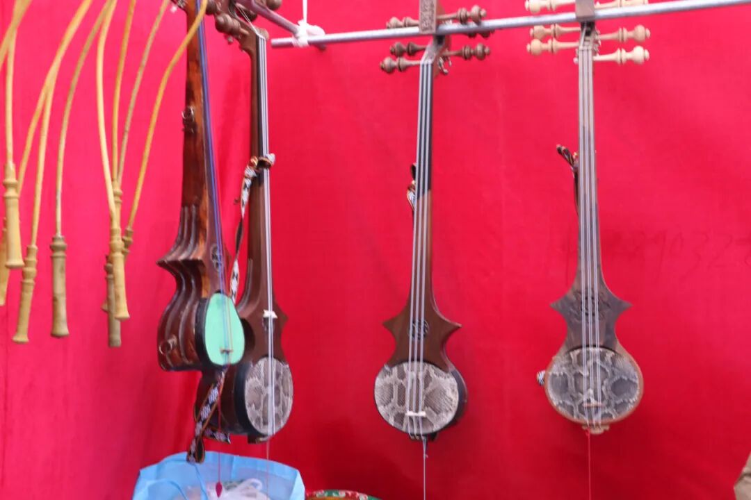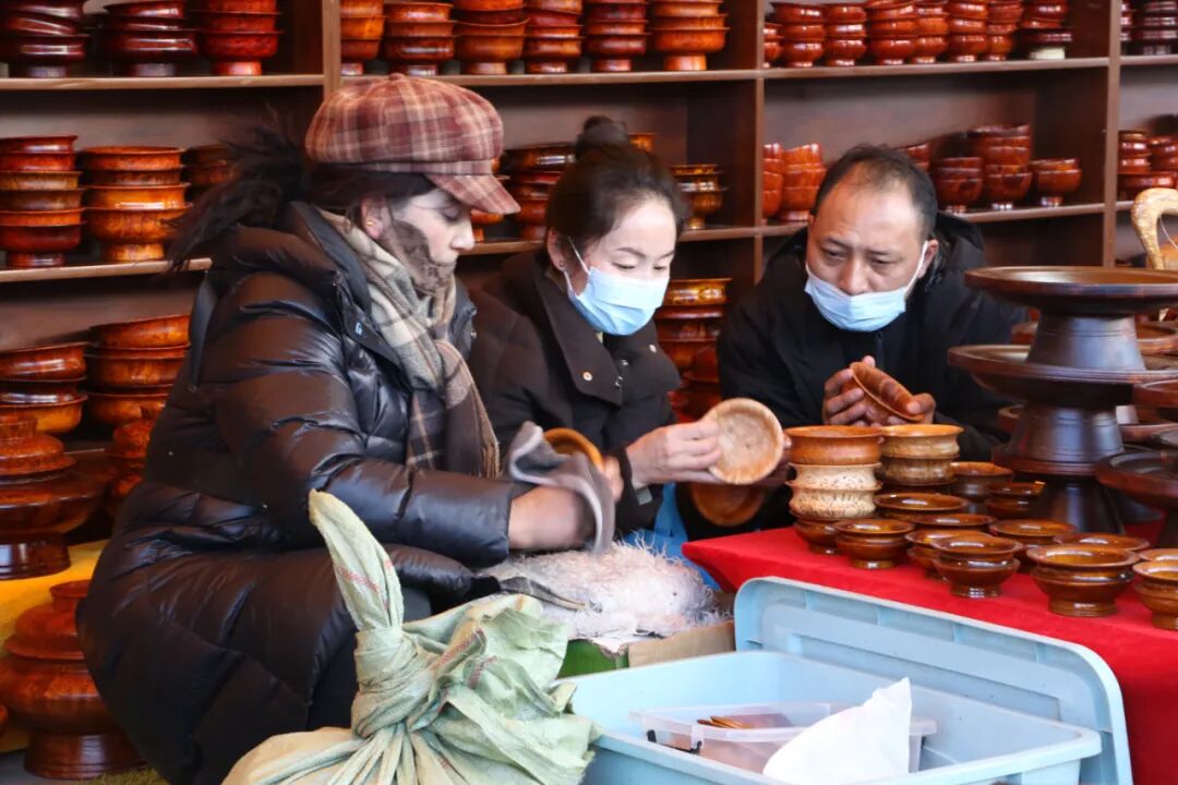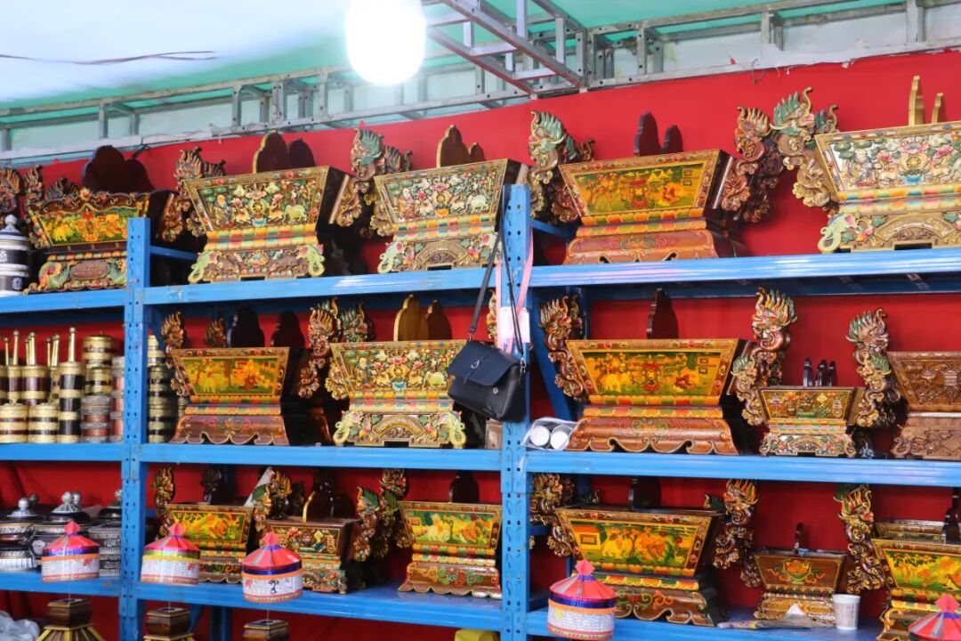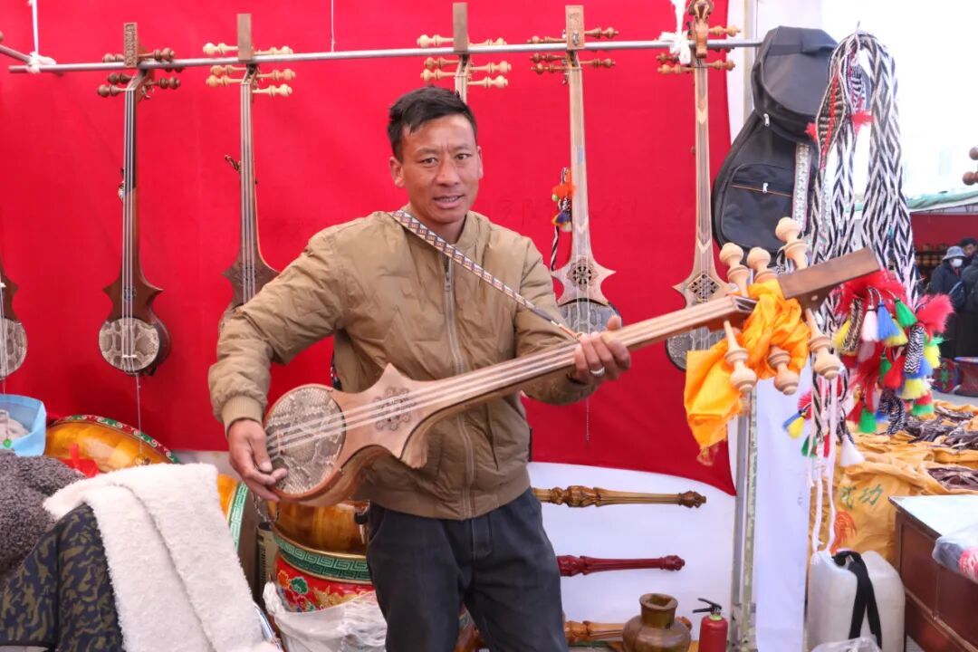 加查县的传统手工艺术琴、鼓专卖店前同样围满了人。县级非物质文化遗产代表性项目代表性传承人次仁多吉正为顾客细细讲解扎木念的选材与制作细节,顾客听得入神,不时点头称赞。他兴奋地说:“这是我第5次参加雅砻物交会,今年带了20多把扎木念和10多个鼓,到第二天就只剩下几把扎木念、2个鼓。每年我们都卖得很好,常常供不应求,刚刚还有顾客要求订做一个。”