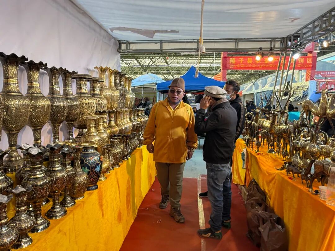 踏入物交会现场,区外展区的异域风情扑面而来。巴基斯坦商户杰克的摊位前围满了好奇的市民,他带来的各式精致铜器泛着温润光泽,雕花木质桌椅透着浓郁的南亚匠意。“这是我第五次来西藏,这里的人们很热情,物交会上有很多人都喜欢我们的东西!”杰克一边用不太流利的中文打招呼,一边介绍自家的工艺品,引得大家纷纷拍照留念。