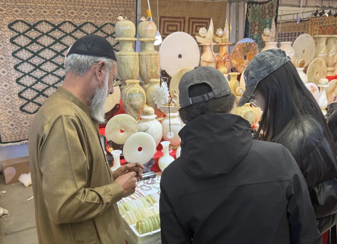 隔壁的不丹展位上,香料、手工皂散发着植物的清香,精致小巧的手工编织包吸引了众多女性顾客,老板正耐心地向客人介绍:“这些都是我们自己手工编织的,背着非常好看。”而尼泊尔摊位的银饰则成为年轻人的打卡热点,精致的雕花耳环、镶嵌宝石的手串,每一件都凝聚着匠人匠心,不少小姑娘对着镜子反复试戴,选中心仪款式便立刻付款。