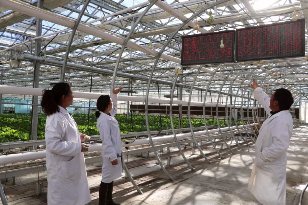 大棚另一角的控制区,技术员格桑德吉和拉珍正盯着智能温控系统的屏幕,指尖不时轻点调整参数。“你看这上面,温度、湿度、光照、土壤墒情的数据实时更新,一目了然。”格桑德吉指着跳动的数字介绍,“棚里装了传感器和自动调控设备,温度高了会自动通风,湿度低了会精准补水,还能让蔬菜生长更均匀,产量和品质都能往上提。”她补充道,基地还集成了防滴露棚膜、水肥一体化精准滴灌等先进设施,从源头减少病虫害,让蔬菜生产更高效、更稳定。