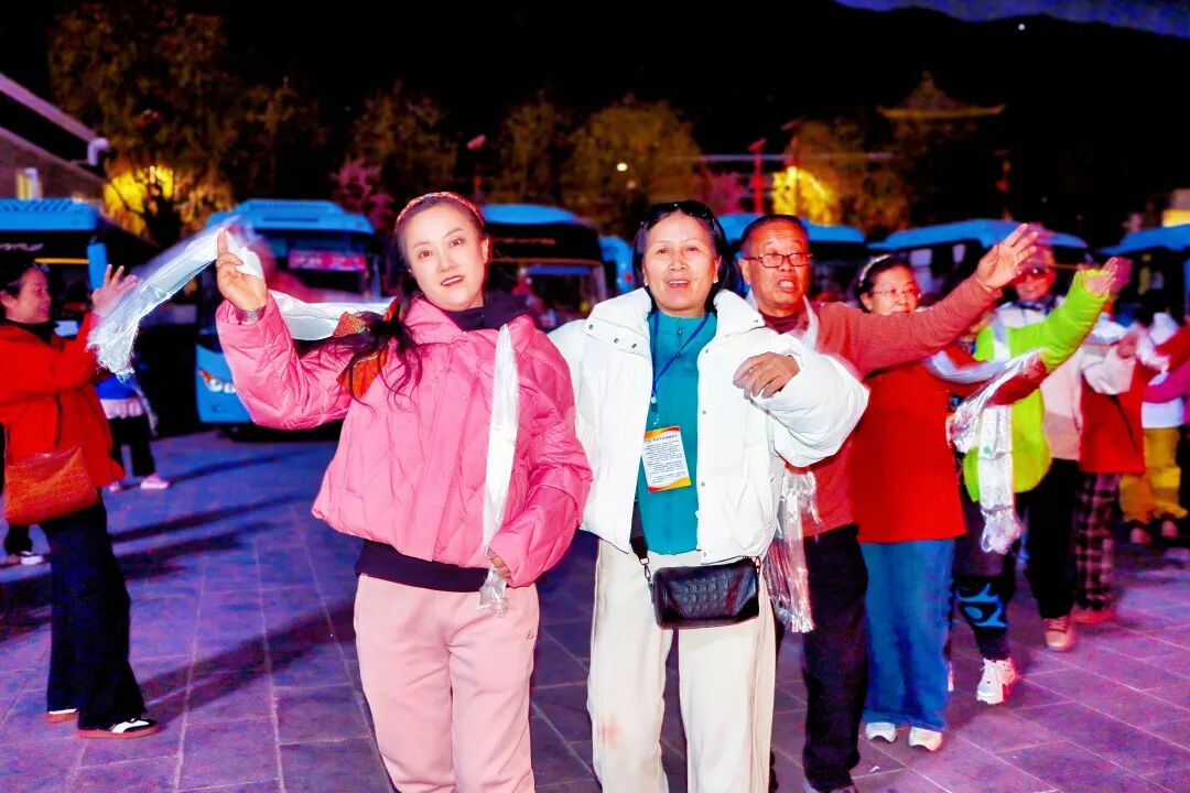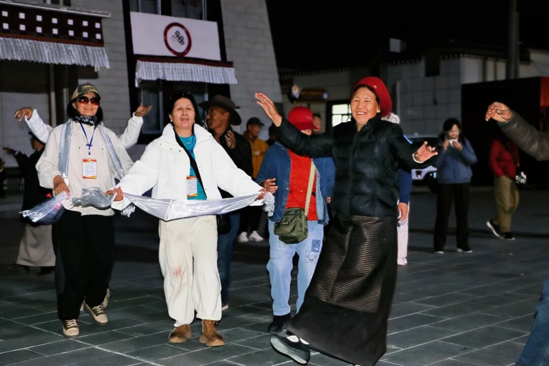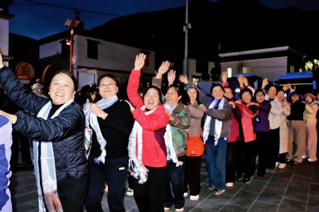 在“藏戏第一村”扎西曲登社区的非遗舞台上,雅砻扎西雪巴藏戏正式开演。演员身着传统服饰,唱腔高亢悠扬、舞姿古朴灵动,生动展现了藏戏百年传承的独特韵味,让专列游客近距离感受非遗的深厚底蕴。夜幕降临,热闹的篝火晚会正式开始,当地群众与游客手拉手共跳锅庄,歌声、笑声、欢呼声此起彼伏,现场气氛热烈温馨,处处洋溢着民族团结一家亲的浓厚氛围。