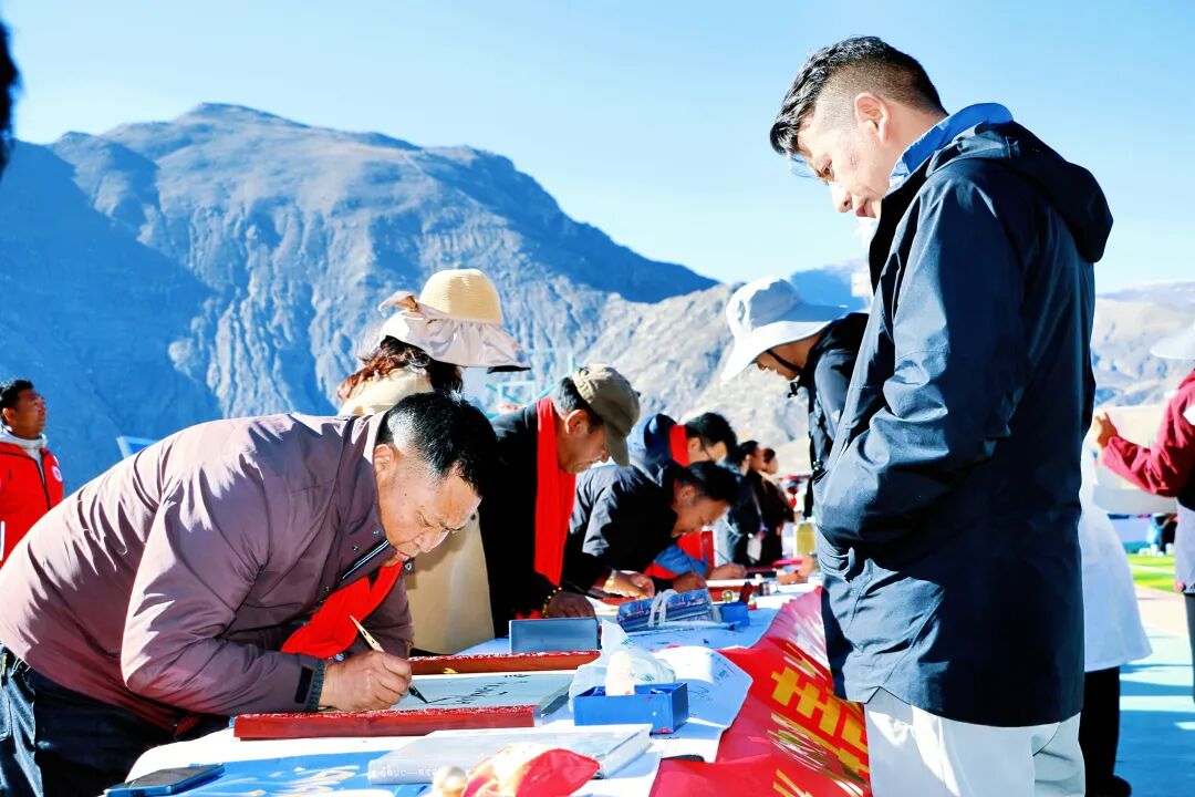 台下,各类惠民服务摊位同样热火朝天。在“笔墨丹青送基层”摊位前,书法家们挥毫泼墨,将一幅幅寓意吉祥的书法作品赠送给群众;不远处的健康义诊点,医护人员耐心地为村民测量血压、把脉问诊,并发放常用药品;普法宣传和“科普进万家”展台前,工作人员用通俗易懂的语言讲解法律常识和防灾减灾知识;“农技指导进乡村”的专家被群众团团围住,细致解答青稞种植、畜牧养殖中的实际问题;“特色展销助振兴”区域,本地蜂蜜、奶制品等农特产品琳琅满目,吸引了不少人驻足选购。各服务摊位前人来人往,村民在轻松的氛围中既学到了知识,又享受到了实惠。