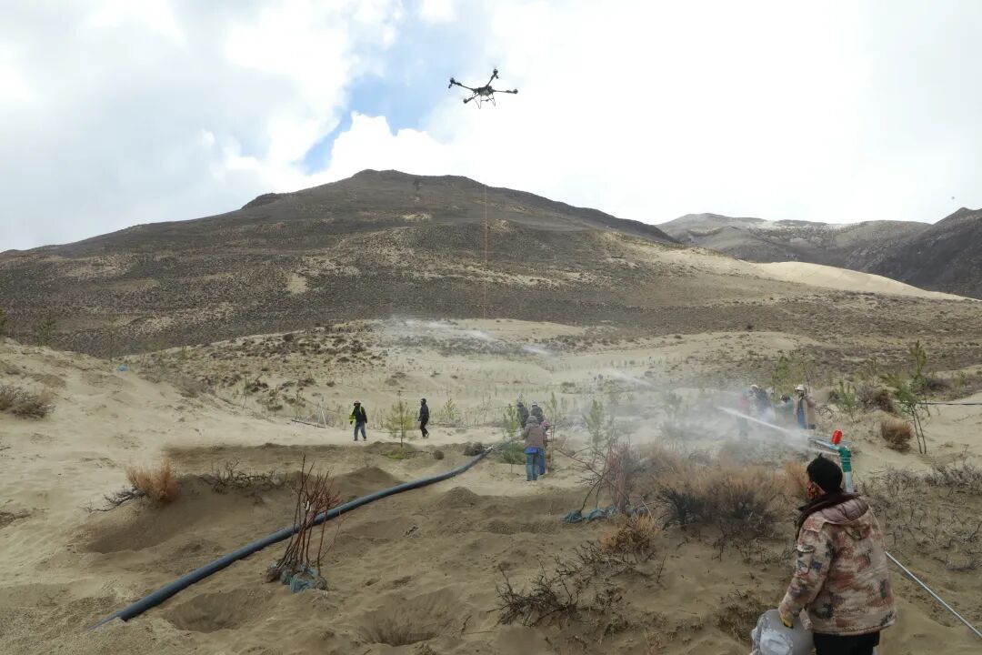南北山绿化(山南段)2026年度乃东区营造林先造后补工程三标段(桃花沟片区),无人机往来穿梭,施工人员各司其职、紧密配合。大家严格按照造林技术标准,细致开展土地平整、土壤改良与施肥作业,为苗木生长营造良好的土壤环境;在种苗栽种环节,规范流程,确保苗木成活率;浇水工作紧跟其后,通过精准浇灌保障苗木水分供应。每一道工序都严谨细致、一丝不苟,全力打造高标准生态造林工程。