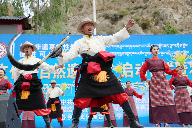 在非遗节目展演现场,国家级非遗琼结卡卓扎西宾顿藏戏队带来的传统戏剧《吉祥之音》、自治区级非遗琼结拉玉堆巴谐钦带来的传统舞蹈《福满大地》以及朗玛堆谐《亚吉查姆》、卓舞《鼓乐齐鸣》、舞蹈《果谐的起源》等精彩节目轮番上演,充分展示了琼结县在非遗保护和传承等方面取得的新成效。台下观众沉浸在非遗节目的魅力里,不时发出阵阵掌声。
