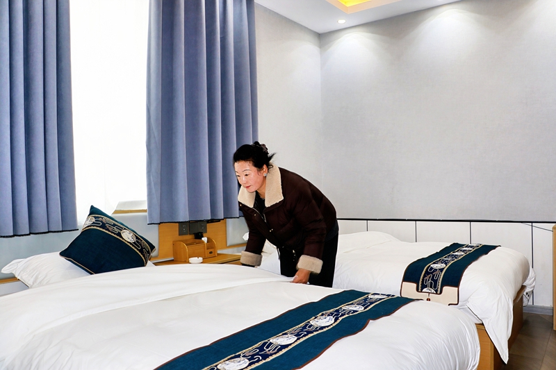 民宿产业的蓬勃发展,也为当地村民提供了就近就业的好机会。村民措姆就在一家家庭民宿上班,平日里帮忙打理民宿相关工作,在家门口就能稳定就业,收入十分可观,月收入最高可达5000元,不用远离家乡,便能兼顾家庭与工作,生活过得越来越红火。