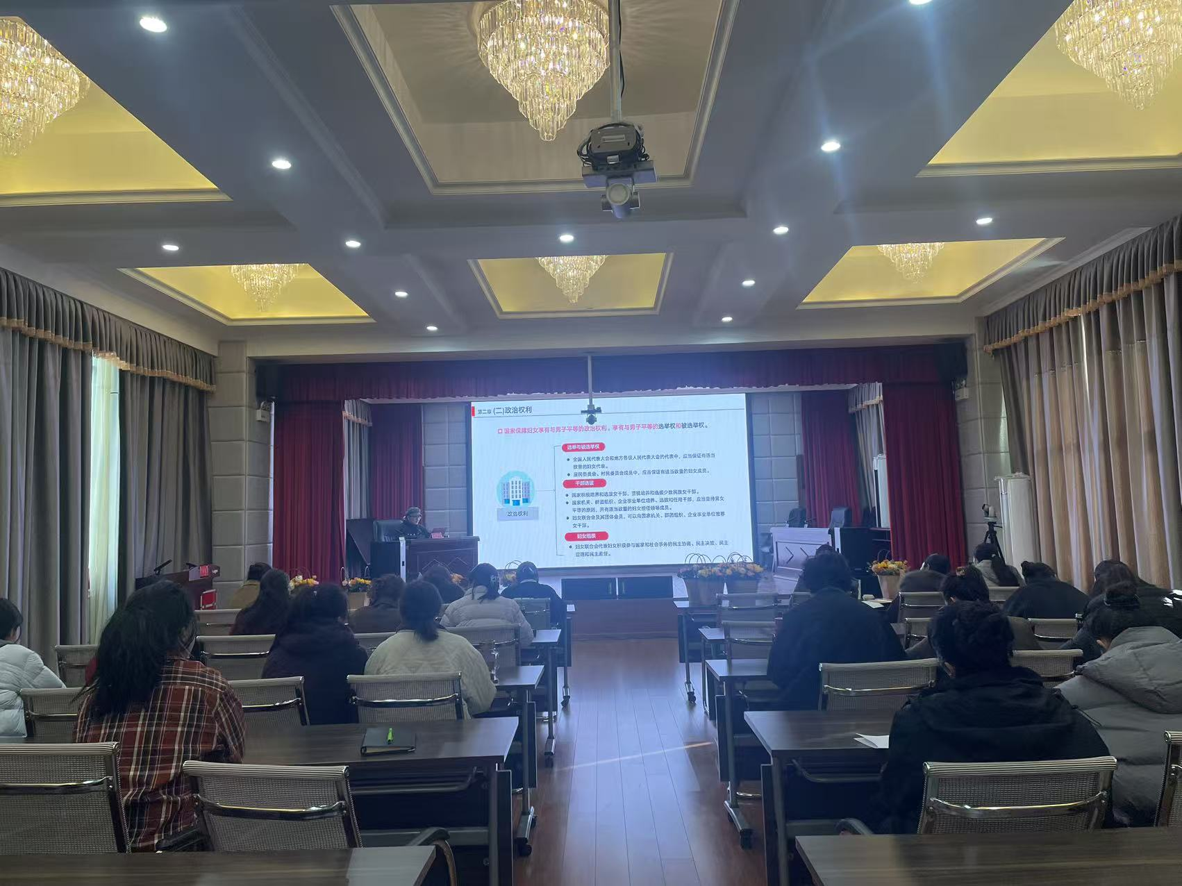 为切实提升女职工法治意识和依法维权能力,筑牢女职工权益保障坚实防线,党总支联合妇委会专门开展妇女维权法律法规专题讲座。讲座围绕《中华人民共和国妇女权益保障法》《女职工劳动保护特别规定》等重点法律法规,结合职场维权、家庭普法、人身权益保护等典型实际案例,用通俗易懂的语言,详细讲解权益保障核心要点、合法维权途径和实用方法,引导女职工自觉尊法学法守法用法,学会运用法律武器维护自身合法权益,进一步增强自我保护意识和法治素养。