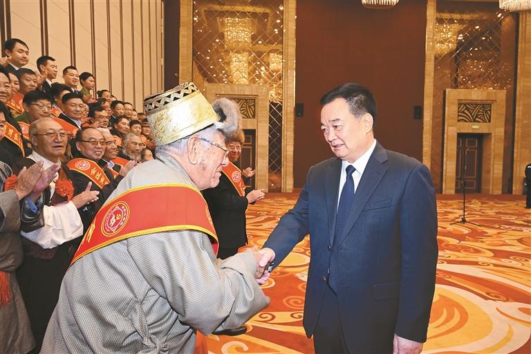 十一月十一日,自治区党委书记王君正在拉萨会见全区离退休干部先进集体和先进个人代表。这是王君正与受到表彰的先进集体和先进个人代表亲切握手。本报记者 李洲 摄
