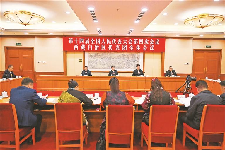 3月9日,西藏代表团举行全体会议,审议全国人大常委会工作报告、关于法律清理工作情况和有关法律和决定处理意见的报告。