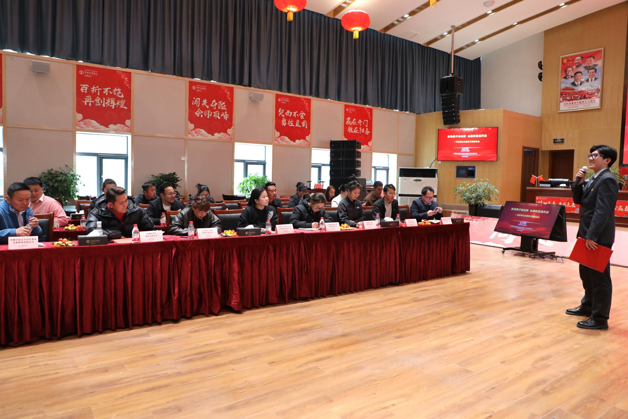企业家代表西藏夜伴蜂声文化旅游发展有限公司负责人分享了企业发展经验,展现政银企协同下企业的成长路径。随后,农行山南分行客户经理详细介绍了抵押e贷、科技e贷等特色信贷产品,为企业融资提供了多样化的选择。在互动交流环节,客户经理针对企业提出的问题与需求,进行了一对一的答疑解惑。