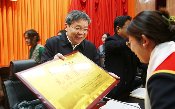 图为许成仓为受表彰的全市生态文明建设先进集体颁奖。