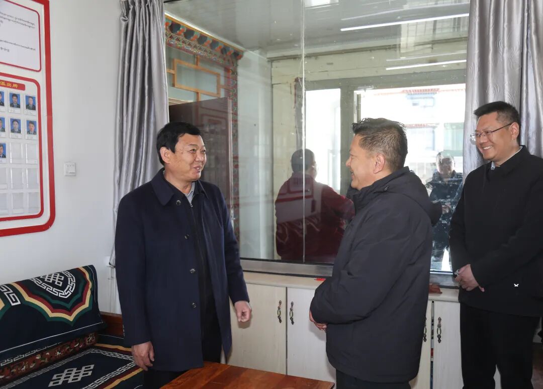 图为李富忠在桑耶寺管会,详细了解“三个意识”教育、维护稳定、消防安全、干部队伍建设等情况。