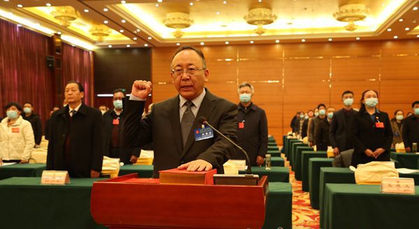 图为市委副书记 代理市长次仁平措正在进行宪法宣誓。